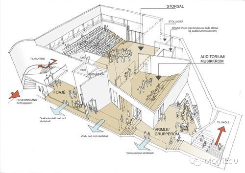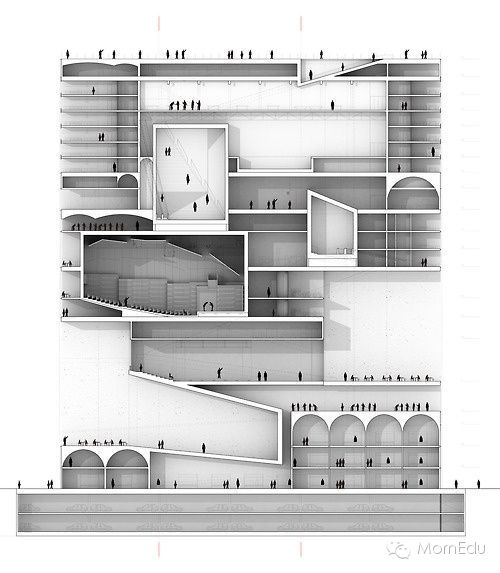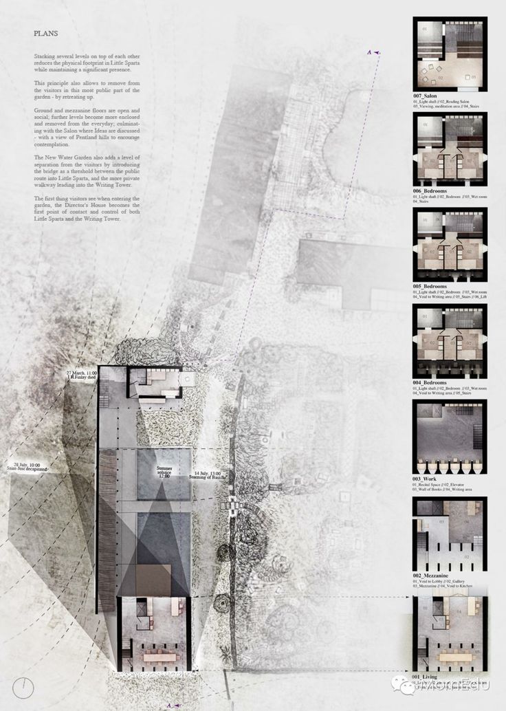 这就涉及到了设计方案中的流线的表达: 最常用的方式是分层罗列的平面。简单标注后,通过读者的空间想象力来渗透空间的流线: