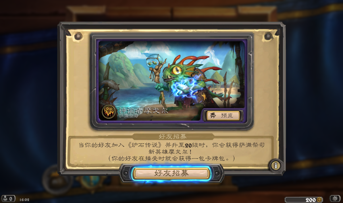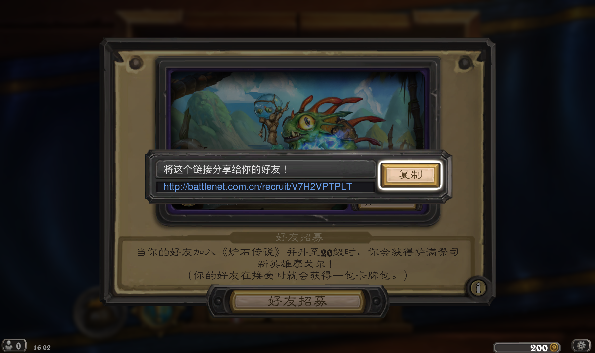 炉石新版本最近更新了一款全新萨满英雄头像[神谕者]摩戈尔还不会领的快进来看看哦[摸头]~今天折腾了一下午总算是弄到手了,特别来活(zhuang)跃(yi)气(ge)氛(bi)first.....进入炉石界面:这是我的小号,可以加我哦~虽然我玩得不好.....点那个好友招募的图标:出现了一个链接,然后再浏览器里打开:打码的是战网的昵称,不是炉石ID呢如果之前没有账号,那就注册一个忘了提前截图,这是后来撤回截的图,就不看我的信息了吧(害羞)如果你有账号的话,那个账号所有英雄的等级必须小于20才能被招募,如果大于20....那就...重新注册一个号吧,或者可以安利你好友来玩~欢迎酱紫→.→然后就开始小号升级之旅吧,把总体的等级升到20,大号就可以获得长者皮肤啦~大号里查看我的收藏,诺,这就是新皮肤而且在大号的好友招募可以查看进度成功安利一波,让我们跑起来吧,哈哈哈哈哈[查看全文]