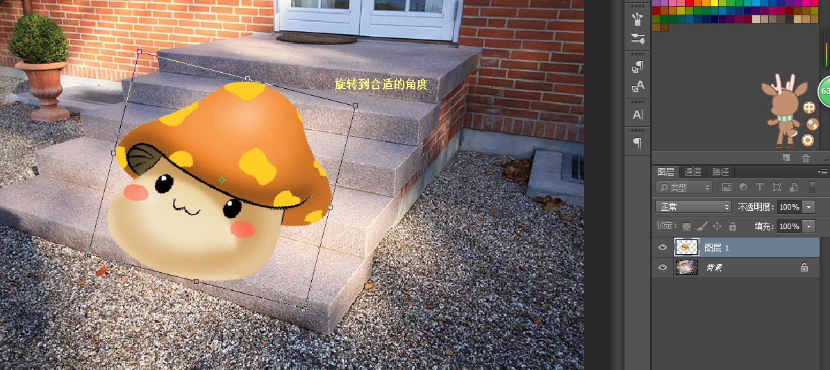 2.通过Ctrl+T,自由变换把蘑菇调整到合适的大小,在通过Ctrl+T的斜切,将蘑菇的角度与台阶的角度调整到平行的角度,最后调整到合适的角度即可。[查看全文]