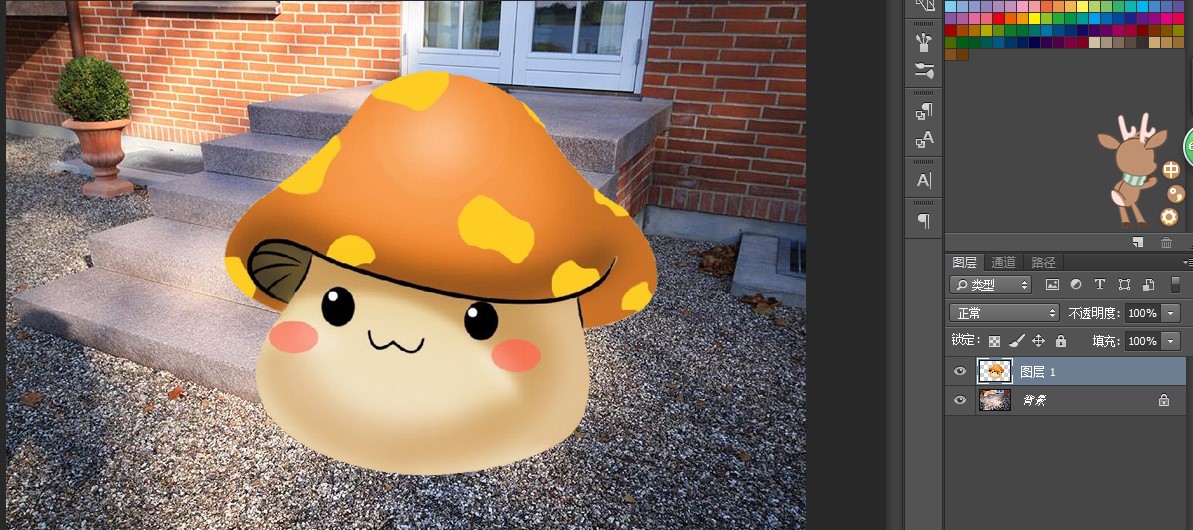 1.在PS中打开素材图片,将蘑菇移动到台阶素材中。