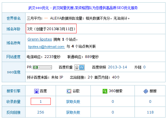 这两天以来我们虽然没有夜以继日的发布关于武汉SEO外链,也没有不断的写着关于武汉SEO的原创文章,但是得到的效果确实很不错的,阿里优搜的反链接目前也才249,而且其中有很多都是刚注册站的死链接,我们的原创内容也就是现在我所写的3篇文章,其余的都只能算是资料文章和参考文献。