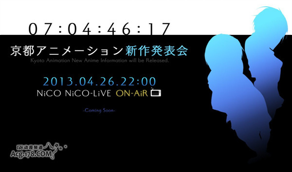 今日(4月19日),京阿尼一个迷之新作倒计时网站上线,同时网站上公布了新作动画的剪影,并表示相关发布会将于4月26日晚22:00(北京时间21:00)在NICONICO生放送中直播,发布会的司仪将是经常主持动漫活动的人气主播吉田尚记。目前关于新作有着种种猜测,根据倒计时网站提供的剪影,大家是否能看出一些端倪?目前京阿尼新作相关的作品包括此前公开过PV的游泳运动类动画「Animation Do Sexy Swimming」(标题未定),另外还有可能会有新动作的动画「中二病也想谈恋爱!」,最后则是已经公开官网和CM的动画化作品「境界的彼方」。当然,新作亦有可能与上面几部作品完全没有关系,不过看剪影的蓝色总有一种回合水泳部相关的赶脚……此外,中二病决定在6月9日召开上映会活动,届时将放映未放送的第13话和Lite版全集。虽然不清楚这个活动是否是中二病「邪王真眼契约更新!」的真相,不过总有一种新作和中二病关系不大的预感……