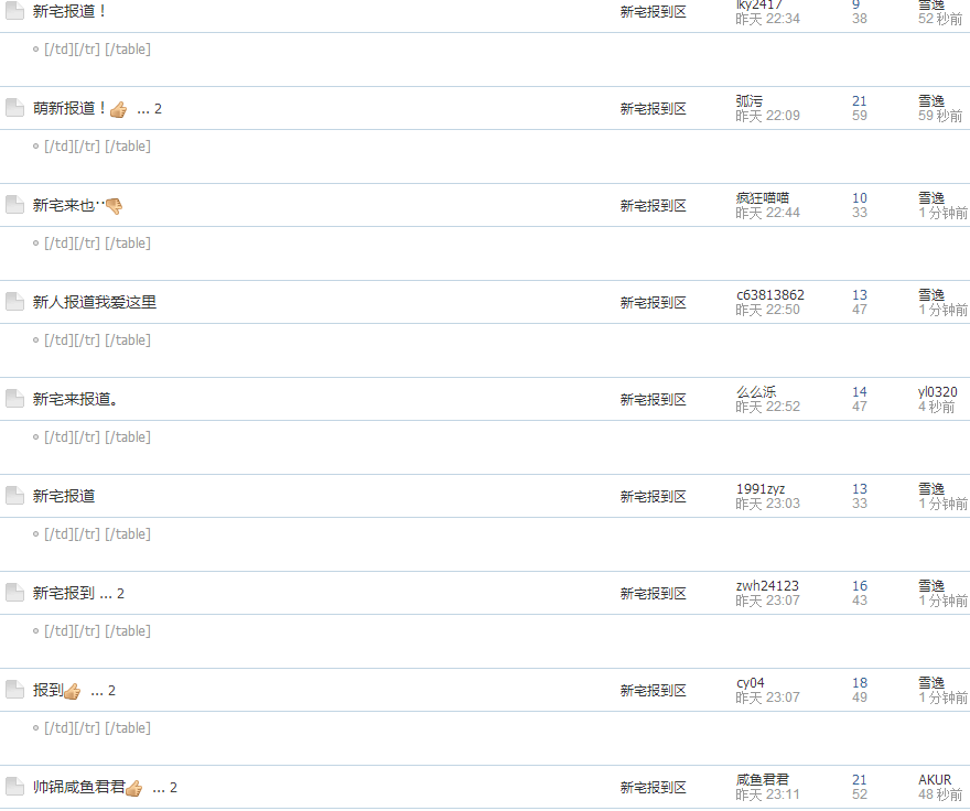 回复新发布的报到贴,所发内容不能过于敷衍,不可一贴重复迎新②申请迎新编码请按照格式回复,回复前请查看所申请编码是否有人使用,已使用编码不予通过,可在版主提醒后修改所选编码重新艾特版主