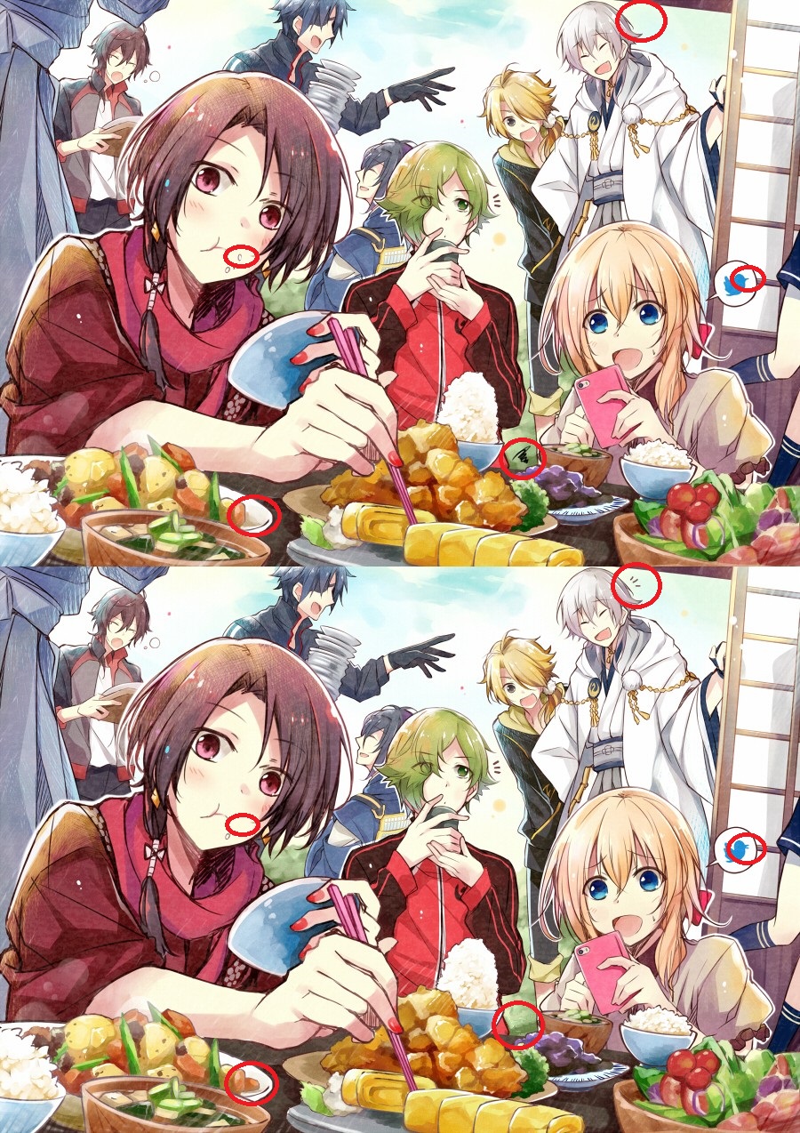 眼瞎的我不适合找茬:1、清光脸上的饭粒2、乱的手机上推特标记的小鸟的嘴3、鹤丸脸右边的三点啊,活动结束统一评分吧,省得我还要添加OTZ[查看全文]
