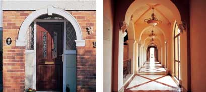 3、门廊、圆拱和镂空。这是地中海建筑中最常见的三个元素:长长的廊道,延伸至尽头然后垂直拐弯;半圆形高大的拱门,或数个连接或垂直交接;墙面通过穿凿或半穿凿形成镂空的景致。众多的回廊、穿堂、过道,一方面增加海景欣赏点的长度,另一方面利用风道的原理增加对流,形成穿堂风这样的所谓被动式的降温效果。