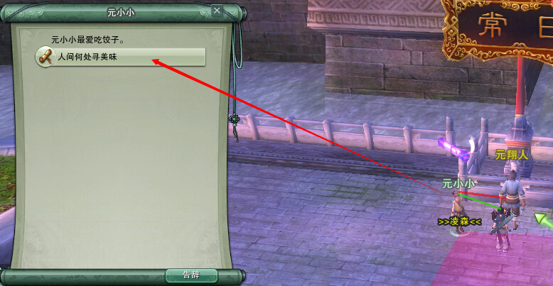 ②飞到扬州日常区找元翔人交任务,和元小小元翔人叨逼叨一顿任务后从元小小处接到【人间何处寻美味】