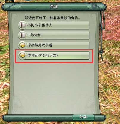 接了【不拘小节喜助人】后继续和范统对话【我该如何引他出来?】说完后他会给你【一盘生饺子】