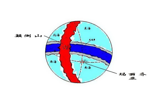 就是地图图中红色带上的星号。四条斜边是从四海流入的水道,在山顶汇聚后再由一条横向的水道流出,即是伟大航道了。