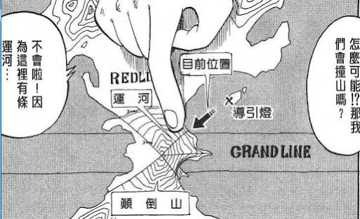 与赤色大陆Red Line垂直相交的环状海洋区域。是世上最神奇、最危险的航道,所有海盗梦想中的终极宝藏——One Piece就在伟大航道的某处。(图中深蓝色部分)