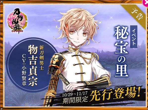 在该次活动中,新刀剑男士“物吉贞宗”将会先行实装。各位玩家不要错过这次最早入手“物吉贞宗”的机会!为了能够多次出阵“秘宝之里”,小判是非常必要的。目前正在进行的远征拿小判活动,大家也要积极参与哦!嗯哼,意思是参与活动是要消耗的小判的节奏了~23333各位婶婶们有木有准备好足够厚实的钱包君捏【QAQ才不告诉你我的心在滴血#7131!着急有木有!缺钱有木有!!#7215! 一同去远征吧 远目。。。