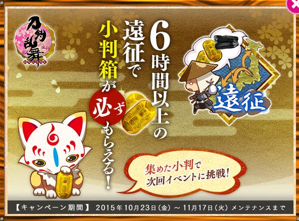 10月23日~11月17日期间,举行了进行6小时远征获小判箱的活动。为了迎接即将开始的能够入手到物吉贞宗的新活动,各位婶婶要好好准备足够的小判哦!为此,在这段时间内,婶婶们可以多去进行能够获得小判的远征,通过活动奖励和远征大成功来入手更多的小判!现在才看到的简直想哭,之前的活动也没有参加我是错过了多少小判_(:зゝ∠)_翻滚不嗨森_(┐「ε:)_