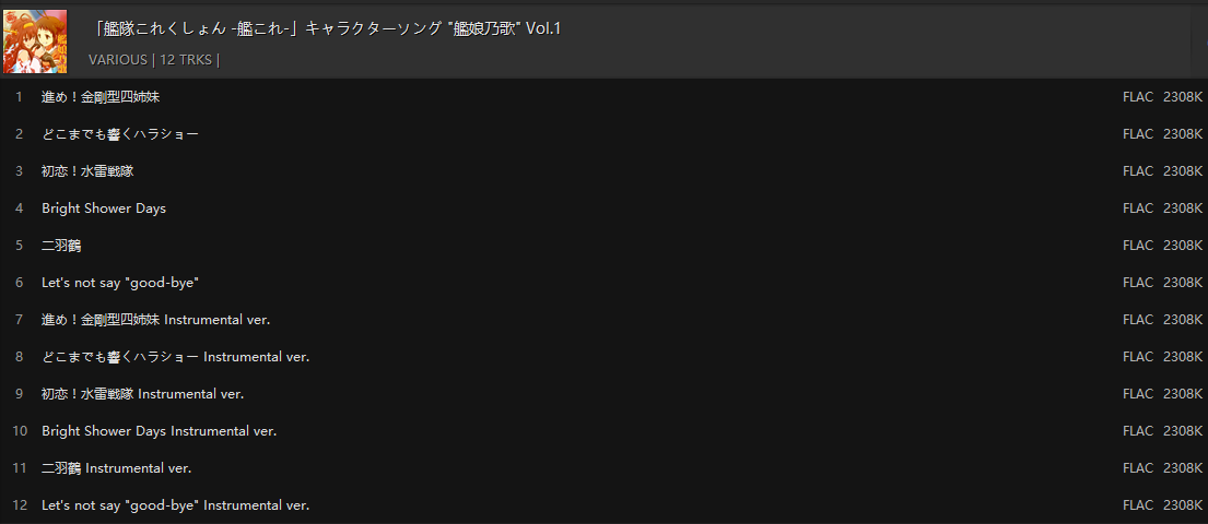 舰娘乃歌Vol.1收录动画中登场舰娘的CV所演唱的曲目以及其伴奏版本。2015年3月25日发售。
