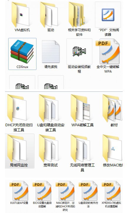 新手只要设置电脑光驱启动,用BT5光盘启动LINUX系统或者使用视频教材用VMware虚拟机启动linux后进行全中文一键破解WEP,WPA方式密码按光盘里目录下的教材进行学习。