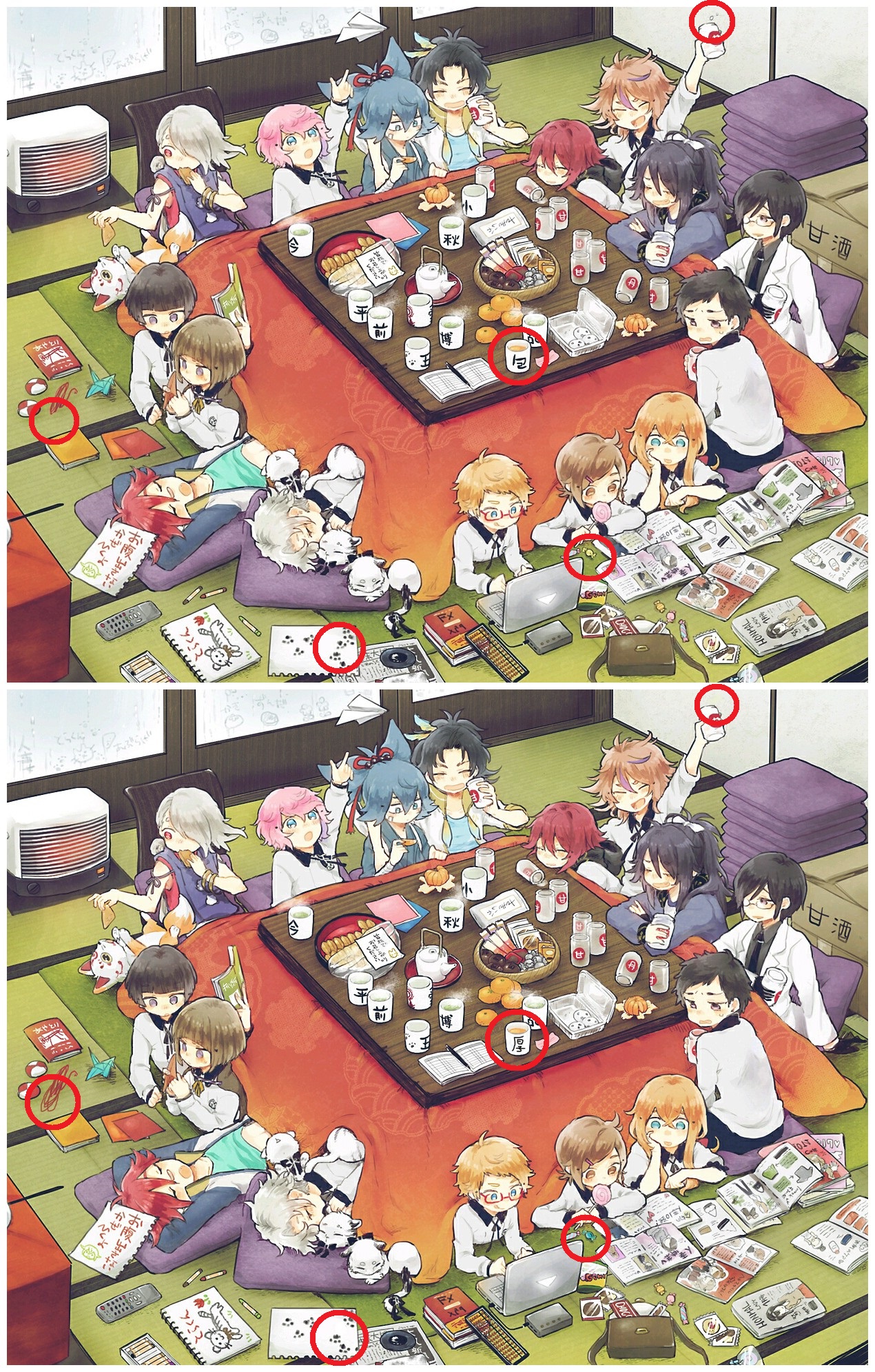 居然都找到了!第一次! 大将组喝着酒,女子组(?)在一边研究着各种时尚杂志【厚还在一边无奈地看着hhh 博多还是在炒股#6990!,退酱和小老虎缩在被炉里真可爱www画的画也很可爱哟 萤丸留了张小纸条给国俊,小肚子露出来了www【我猜看不懂日文#7053! 平野教前田折千纸鹤,今剑拿着油豆腐逗狐之助嘿嘿嘿真好玩#7036! 向往着天空,放着纸飞机 乖乖地坐在一边一瓣一瓣地吃着橘子 还有很多很多有意思的点#6958! 他们都超级可爱哒#7030! [attach]486189[/attach]