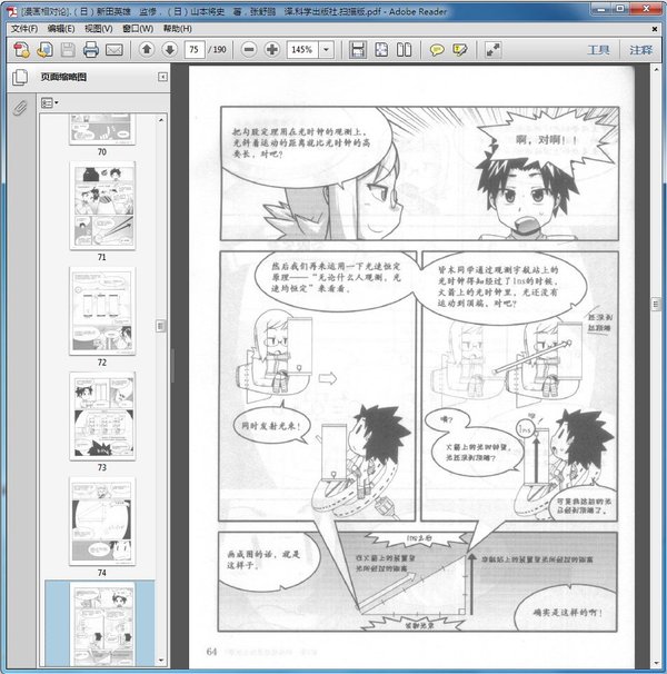 编辑推荐: 用漫画和说故事的形式讲数学,使面貌冷峻的数学变得亲切、生动、有趣,使学习数学变得容易。将抽象、复杂的相对论知识融会在轻松有趣、通俗易懂的漫画中,让人们在看故事的过程中就能完成对物理学相关知识的“扫盲”。读完本书,您一定会感觉,原来相对论并没有我们想象得那样高深,它就在我们身边,我们每天都会触到它。 内容简介: 本书以轻松有趣、通俗易懂的漫画及故事的方式将抽象、复杂的相对论知识融会其中,让人们在看故事的过程中就能完成对物理学相关知识的“扫盲”。读完本书,您一定会感觉,原来相对论并没有我们想象得那样高深,它就在我们身边,我们每天都会触到它。 这是一本实用性很强的图书,与我们传统的教科书比较起来,具有几大突出的特点,一漫画的形式更易于让人接受,二边读故事边学知识,轻松且易于记忆,三更能让读者明白并记住相对论相关问题在现实生活中的应用。通过这种轻松的阅读学习,帮助读者掌握在实际工作中要用到的相对论常识,也可以作为广大青少年的物理学知识读本。 作者简介: 1984年北海道大学大学院工学研究科应用物理专业结业。现任Yaa Ba有限公司董事长。 主要著作有《用Excel学基础物理学》(合著,欧姆社)、《用Excel学电磁学》(合著,欧姆社)、《轻松图解光与激光》(合著,欧姆社)、《用Excel学物理模拟》(欧姆社)。 株式会社TREND-PRO 成立于1988年。公司灵活利用漫画为报纸、杂志制作广告专刊,并承接政府、大型企业及社会团体等的广泛领域内的漫画广告制作。近年来,公司利用数字化内容积极参与广告制作与出版策划工作。 内容截图: ![]()