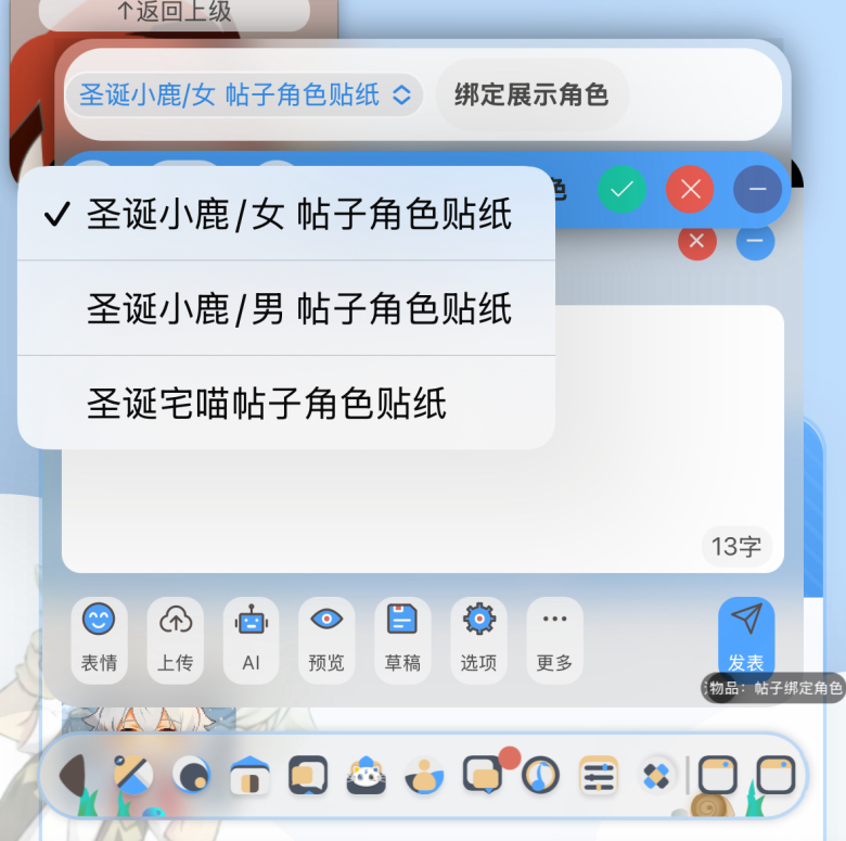 发新帖的时候点击选项——帖子角色——绑定角色