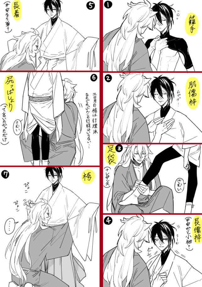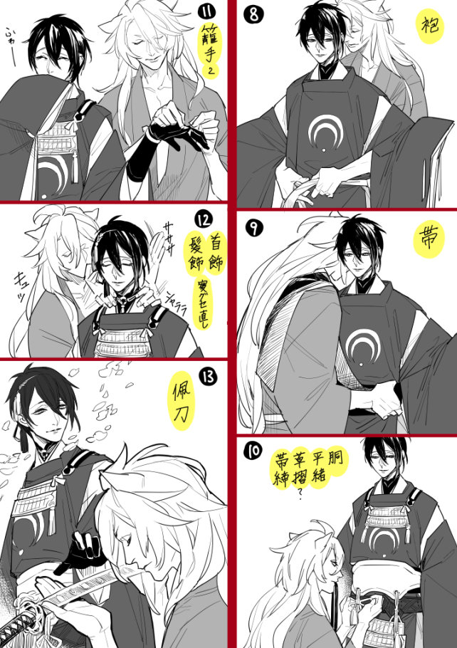 主君:“也不对啊,”打量着三日月,“看你的衣饰样式繁复应该更不容易穿戴,可是每天都一样穿戴的很整齐啊?”