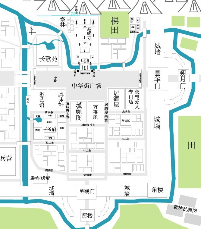 至于几个板块其实我只是画了占地并没有细化他的具体房屋应该是个什么样子,反正是想把他建造的错落有致,能从锦绣门或者昙华门看过来的时候看到整个区域所有建筑。
