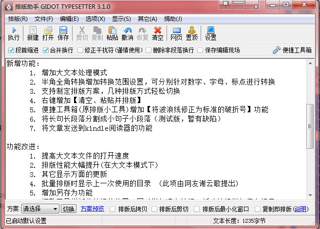 沉寂了两年后,排版助手终于再次回归。此次更新增加了大文本模式,提高大文本文件的载入速度,增加排版方案切换功能,增加半角全角转换的范围选择,还为kindle用户增加了一键发送到kindle阅读器的功能。