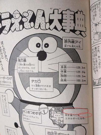 修改后...2012年11月1日,网站“东京福袋”的负责人吉野忍在推特上写道:“儿子发现:哆啦A梦大事典中‘原子炉’、‘原子力’字样消失。”《哆啦A梦大事典》主要解说哆啦A梦身体结构等内容,不过原本“原子炉 可以讲吃下的任何东西转化为原子力(核能)”(「原子ろ 何を食べても原子力エネルギーになる」)的说明被删减成了“可以将吃下的任何东西转化为能量”(「何を食べてもエネルギーになる」)。原来“原子炉”、“原子力”字样的位置则变为空白。