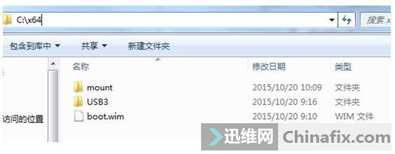③在C盘根目录创建一个文件夹,命名为x64,将Windows 7安装镜像sources目录中的boot.wim文件copy到x64文件夹中。