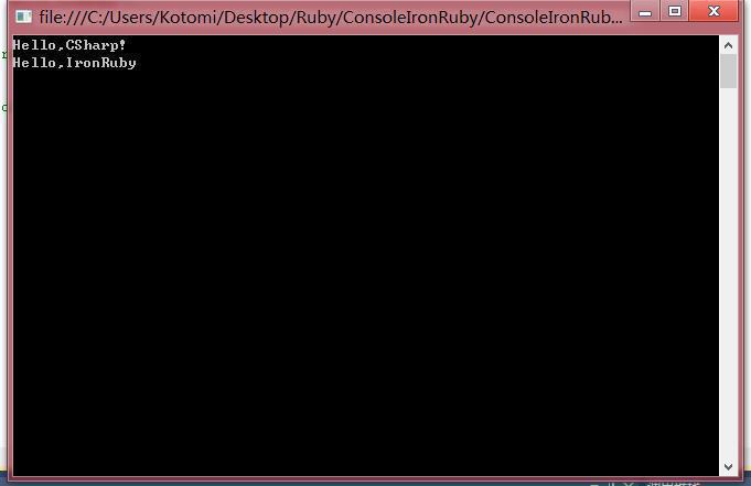 会到C#在Main函数里面写上[mw_shl_code=csharp,true] ScriptEngine e = Ruby.CreateEngine();stringcode;using(var fs = File.Open("Demo.rb", FileMode.Open)){StreamReadersr = new StreamReader(fs);code = sr.ReadToEnd();}e.Execute(code);Console.ReadKey();//用来暂停,好看结果[/mw_shl_code]执行下 就会看到命令行输出这就是用C#执行IronRuby.接下来是IronRuby调用C#的类,函数在C#里面定义函数[mw_shl_code=csharp,true]static public void CSharp_Puts(stringst){Console.WriteLine(st);}[/mw_shl_code]Ruby代码如下[mw_shl_code=ruby,true]require 'System'require 'ConsoleIronRuby'ConsoleIronRuby::Program.CSharp_Puts("Hello,CSharp!")System:: Console.WriteLine("Hello,IronRuby");[/mw_shl_code]require的作用是引用程序集,这是IronRuby的优势之一,直接引用.net程序集ConsoleIronRuby是我们工程的名字再来看C#里面如何调用IronRuby的函数先写Ruby代码[mw_shl_code=ruby,true]class Exampledef sayputs "PrintFrom Ruby"endend[/mw_shl_code]C#:[mw_shl_code=csharp,true]ScriptEngine e = Ruby.CreateEngine();string code;using (var fs = File.Open("Demo.rb", FileMode.Open)){StreamReader sr = new StreamReader(fs);code = sr.ReadToEnd();}e.Execute(code);dynamic ruby = e.Runtime.Globals;dynamic example = ruby.Example.@new();example.say();Console.ReadKey();[/mw_shl_code]结果如下:Dynamic 关键字是运行时解析类型,专门给脚本语言用的@new()是调用构造函数,@的目的是避开C#关键字.上面就把几个基本的运行模式讲完了.下次再说如何在2个语言之间传值,最后我会给出一个Long大神给我的类,把用来运行IronRuby脚本的代码封装了下,用起来挺方便.我也是现学现卖,有问题还请大家指出TM这代码高亮搞毛啊