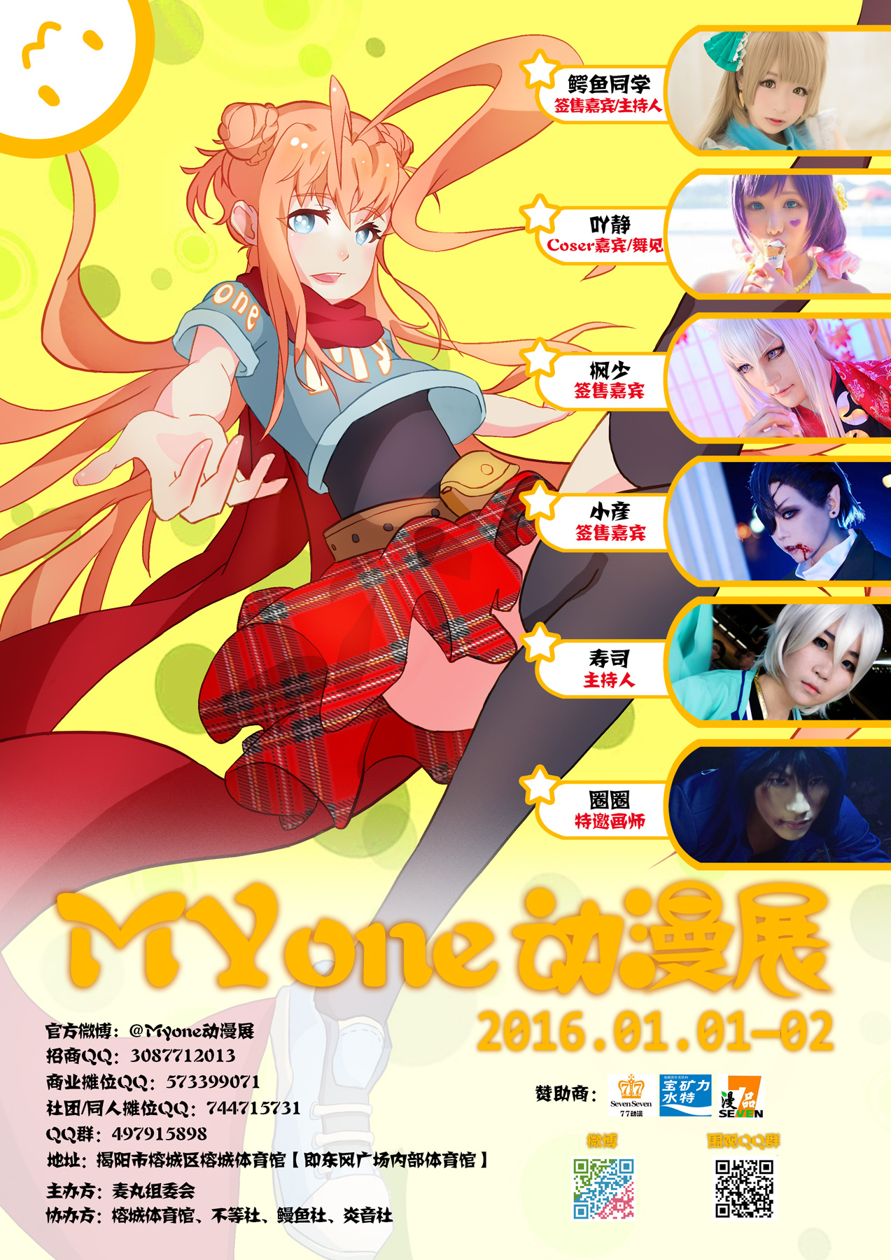 正宣来了。小伙伴们应该等很久了吧!让我们来看看这次漫展的内容吧:首先是涂鸦画布区,小伙伴们可以带上笔,画一幅“惊”艳眼球的画作或是写写心情,留下你来过这里的痕迹。cosplay摄影区,到时摄影区会有一些背景可供coser和摄影自由运用,让你们拍出更好看的大片(场照)!为了让本次展会更加热闹,主办方还邀请了“鳄鱼同学”“吖静”“枫少”“小彦”等人气coser作为嘉宾出席,还有嘉宾签售活动哦!小伙伴们可不要错过了。届时舞台的二次元主持人会由“鳄鱼同学”以及“鳗鱼祭”的主持人“寿司”掌管。海报画师“圈圈”也会出席此次Myone展。接下来还有热血沸腾的激战:第一天燃歌大赛,传说中的大魔王禁锢了王子殿下,被选中的歌姬们啊!用你们的声音…咳咳,回到正题!第一天是燃歌比赛,第二天是宅舞比赛,奖金丰厚,米娜桑加油!还有还有,没得奖的选手也不要气馁,还有人气奖哦。进入前三名的选手们不能重叠人气奖,落选的选手们也有机会得奖。*所有奖项均有麦丸组委会颁发的奖状游客漫展注意事项:1.入场需持有的门票,逾期作废。每票一人 不可一票多用2.届时主办方工作人员采取盖章形式对游客进行标志,凭标志当日可多次出入场地,如擦除标志,则需重新购买门票。3.请注意保管好自己的随身贵重物品,谨防被盗。4.禁止攀爬,禁止乱丢垃圾,随地吐痰,抽烟毁坏或污染馆内设施。Myone展于2016年1月1号~2号举办。地点:揭阳市榕城区榕城体育馆【即东风广场内部体育馆】官方微博:@Myone动漫展(关注官方微博,可得知最新消息,且会不定期举行抽奖活动)QQ群:497915898(有意愿做志愿者的,请到QQ群文件里下载志愿者报名表格)招商QQ:3087712013商业摊位QQ:573399071社团/同人摊位QQ:744715731淘宝预售票链接:http://dwz.cn/27HN3O更多售票点即将公布……[查看全文]