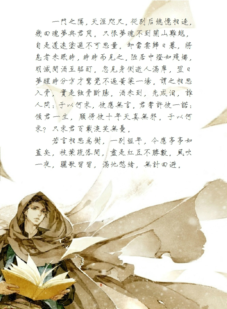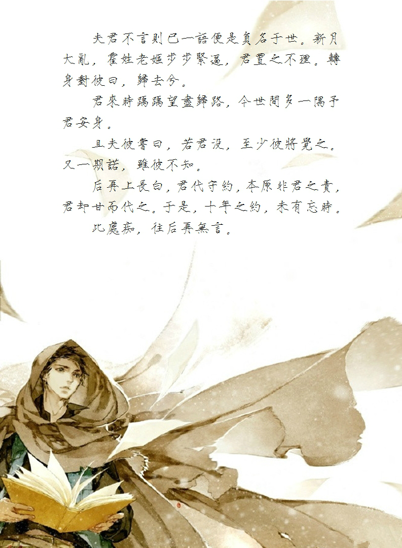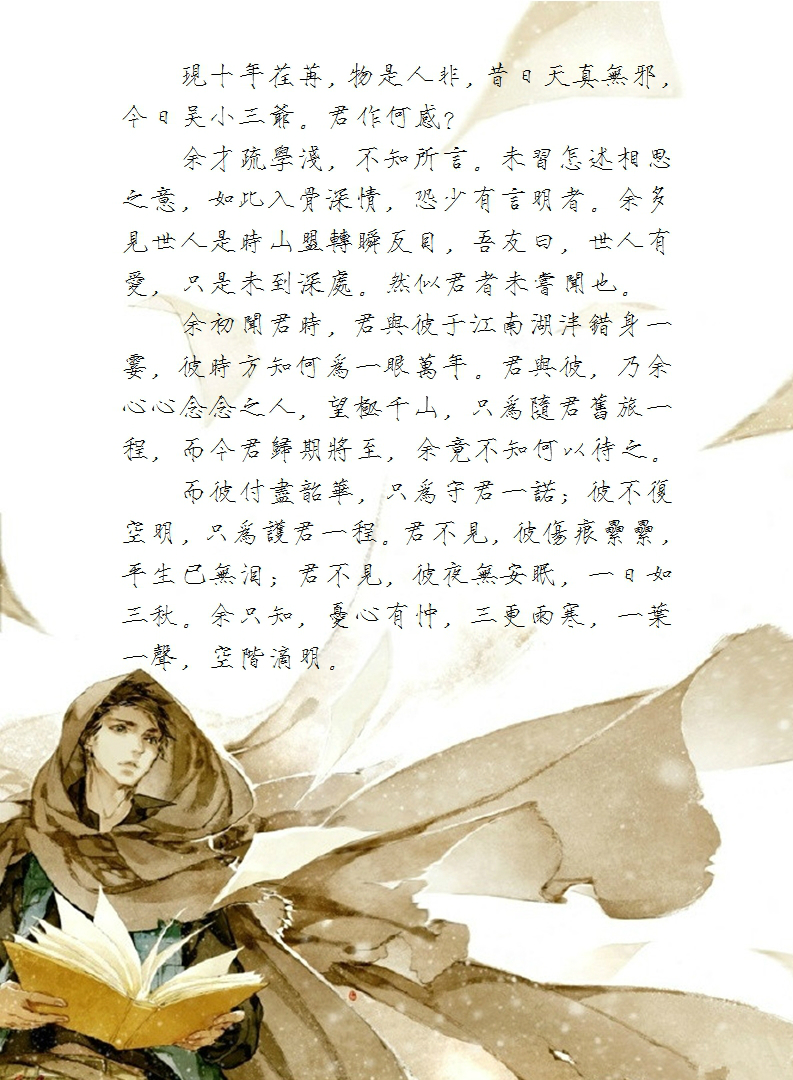 余本是听书人,奈何入戏太深。一席年少旧梦倾之。 君归期将至,回首当年,仿似昔日长白一别尚在目前历历可见。弹指间,十年已逝,故人将聚。君仍青丝不改,友却两鬓斑白。十年于君不过须臾,于彼而言,已是沧海桑田。 君可知,门