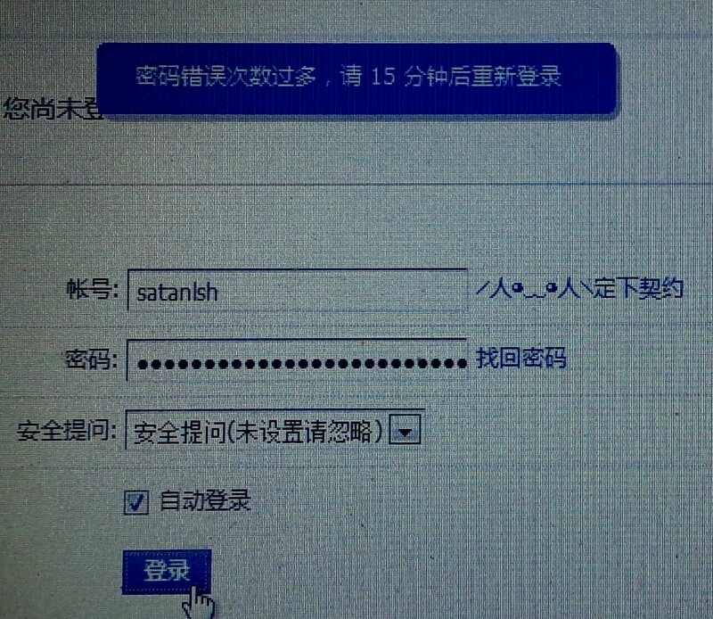 我的账号:satanlsh老是告诉我密码不正确,15分钟后再来,然后一直不对…